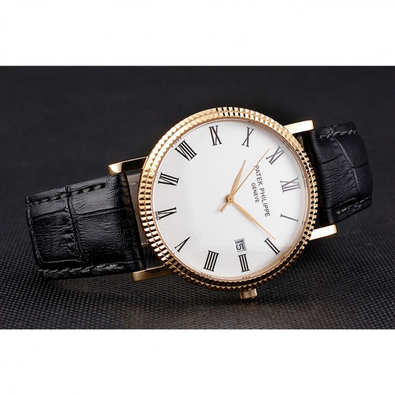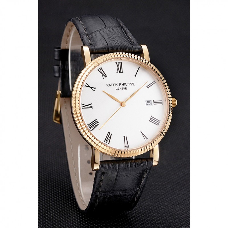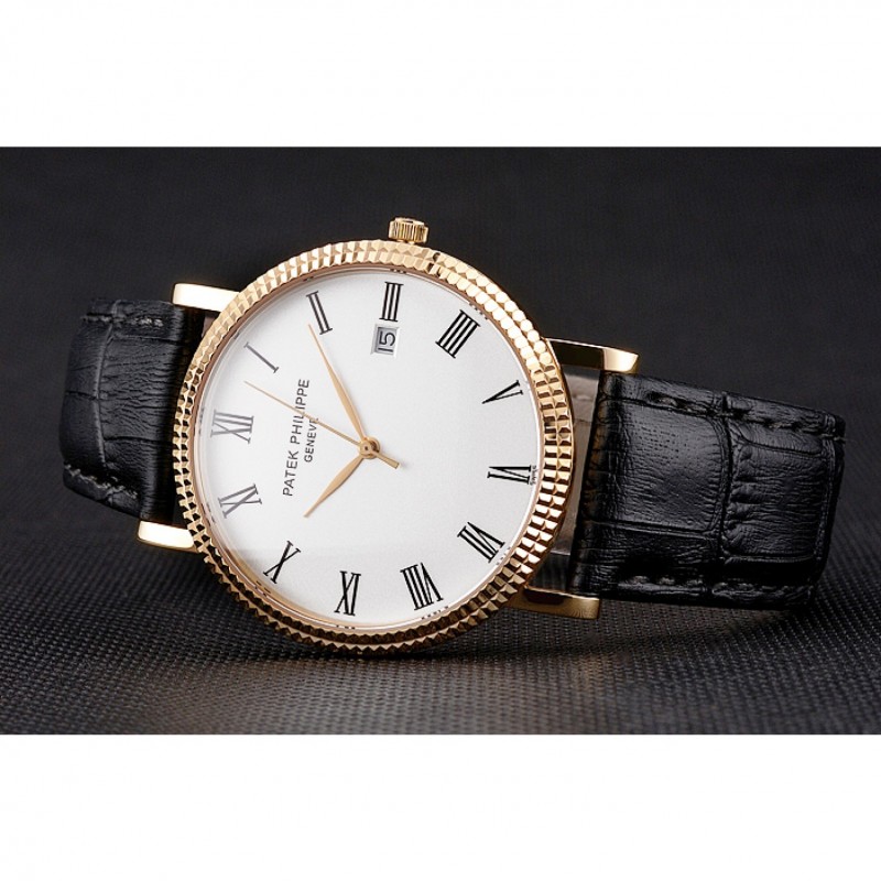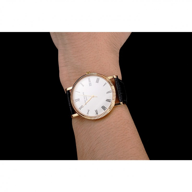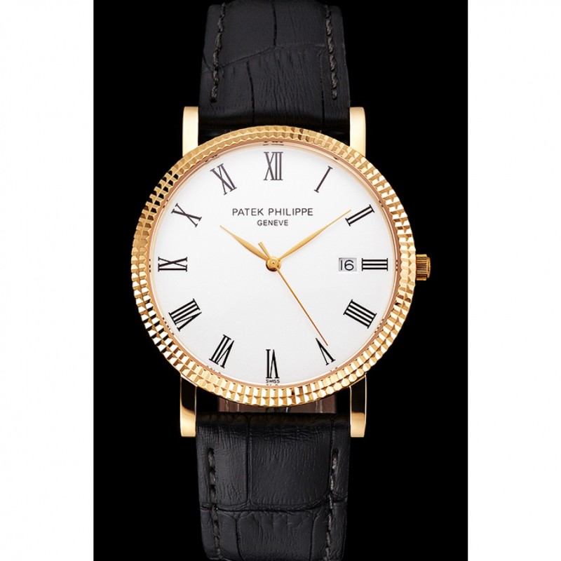 Haute qualité Replique Montre Patek Philippe Calatrava cadran blanc chiffres romains nervuré Bezel boîtier en or Bracelet en cuir noir