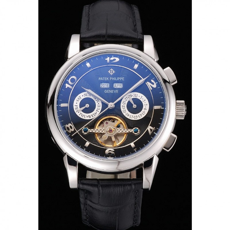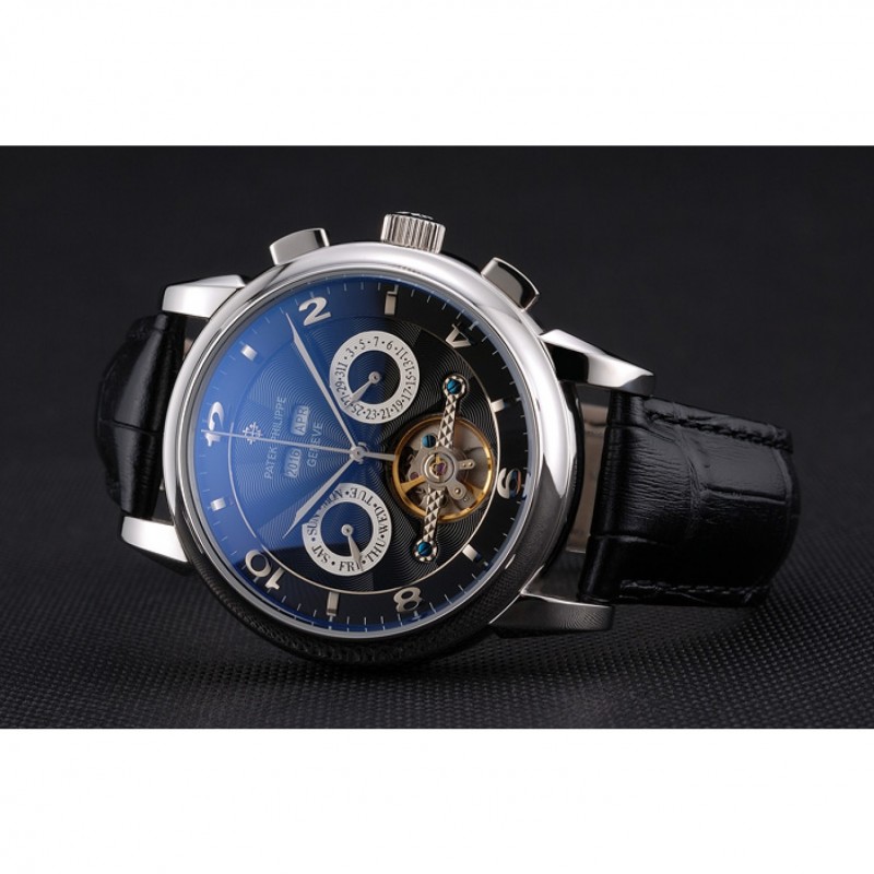 Patek Philippe replique superbe, cadran noir élégant, cuir confortable, un vrai bijou précis et fiable.