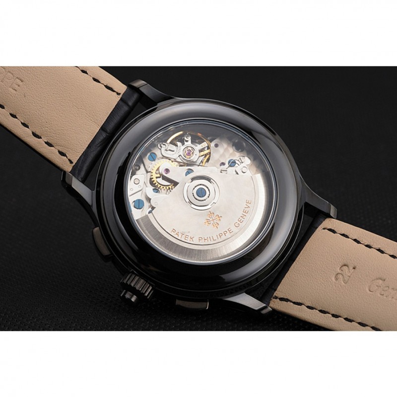 Retour:transparent mécanique révélant retour avec un bord enfichable plaqué ion et inscription Patek Philippe