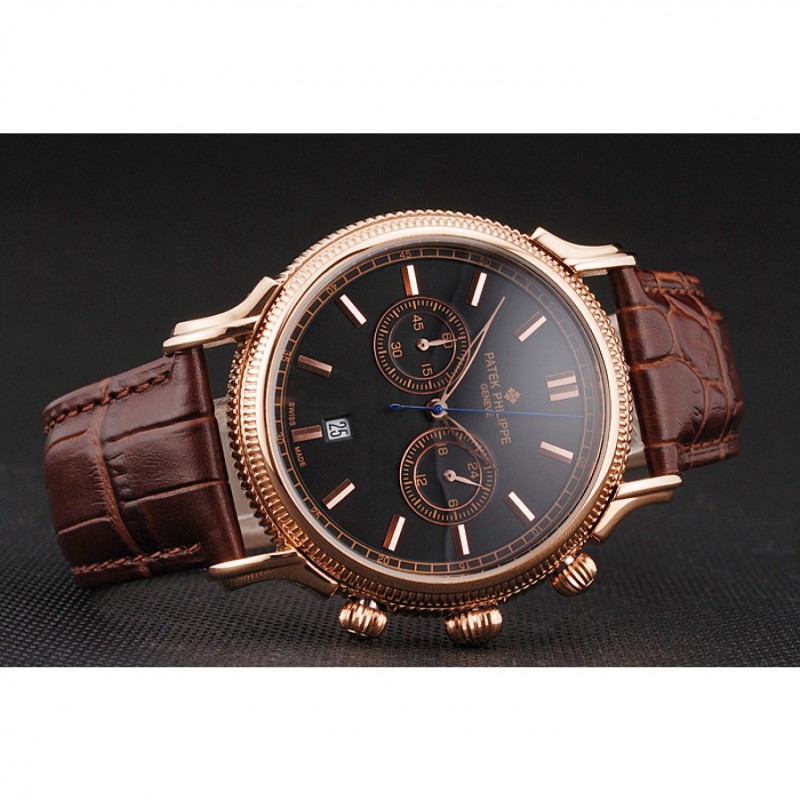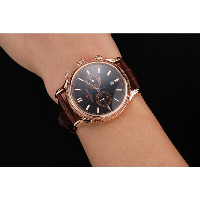 Meilleur Patek Philippe Chronographe Cadran Noir Or Rose bracelet en cuir brun
