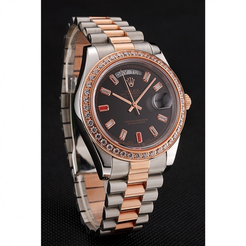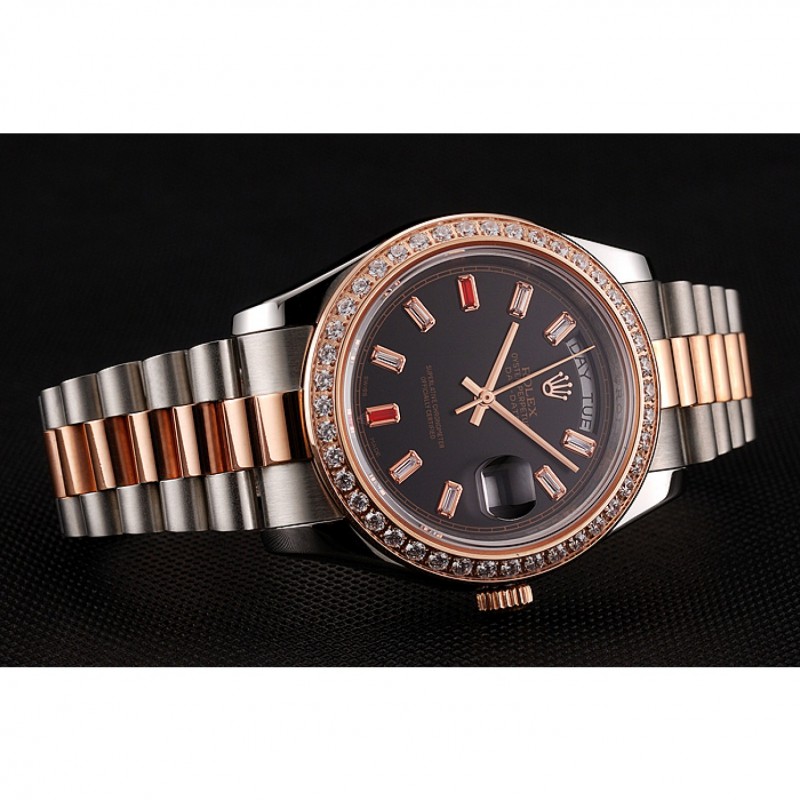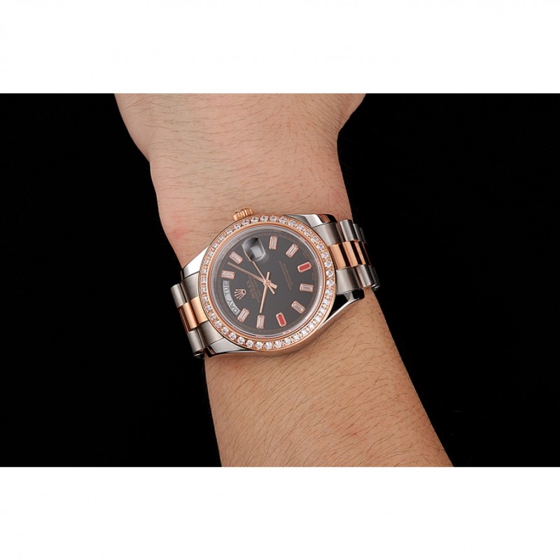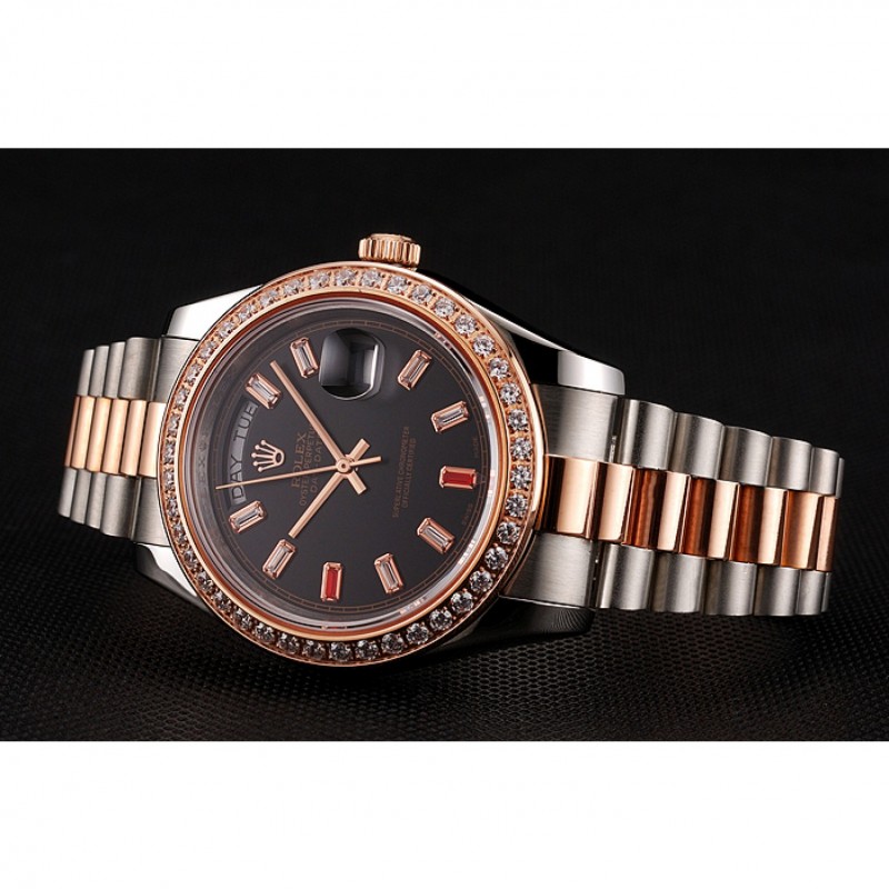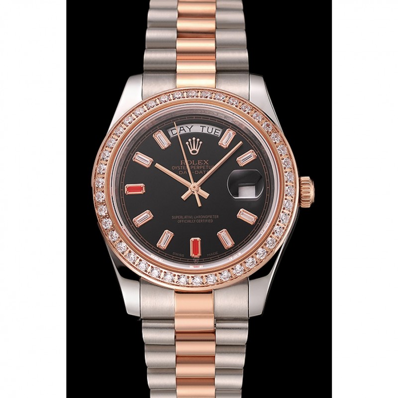 Meilleur Replique Montre Diamants suisse Rolex Day-Date Et Rubies cadran noir en or rose et staineless Bracelet en acier 1454106