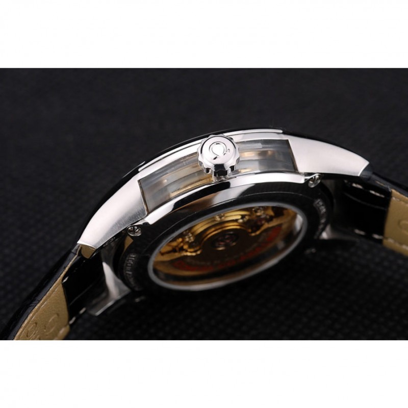 Retour:acier inoxydable poli vissé arrière avec la mécanique révélant transparents centre et gravures Omega