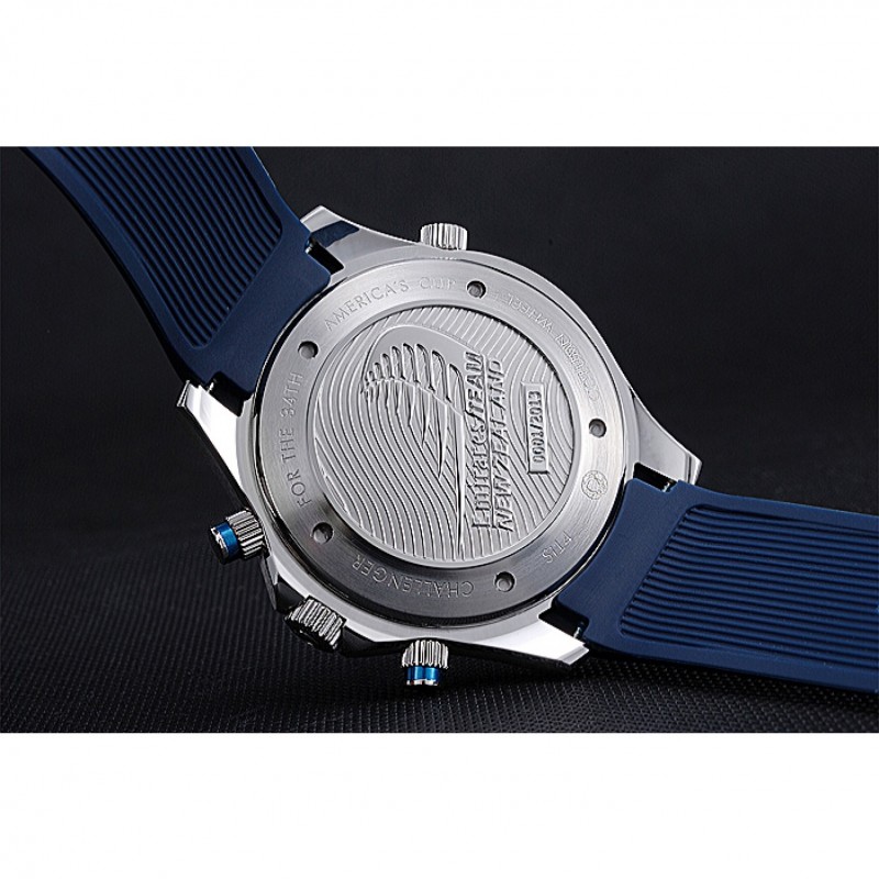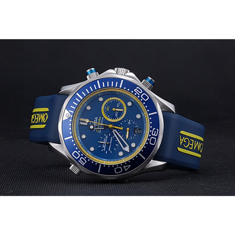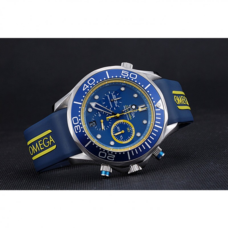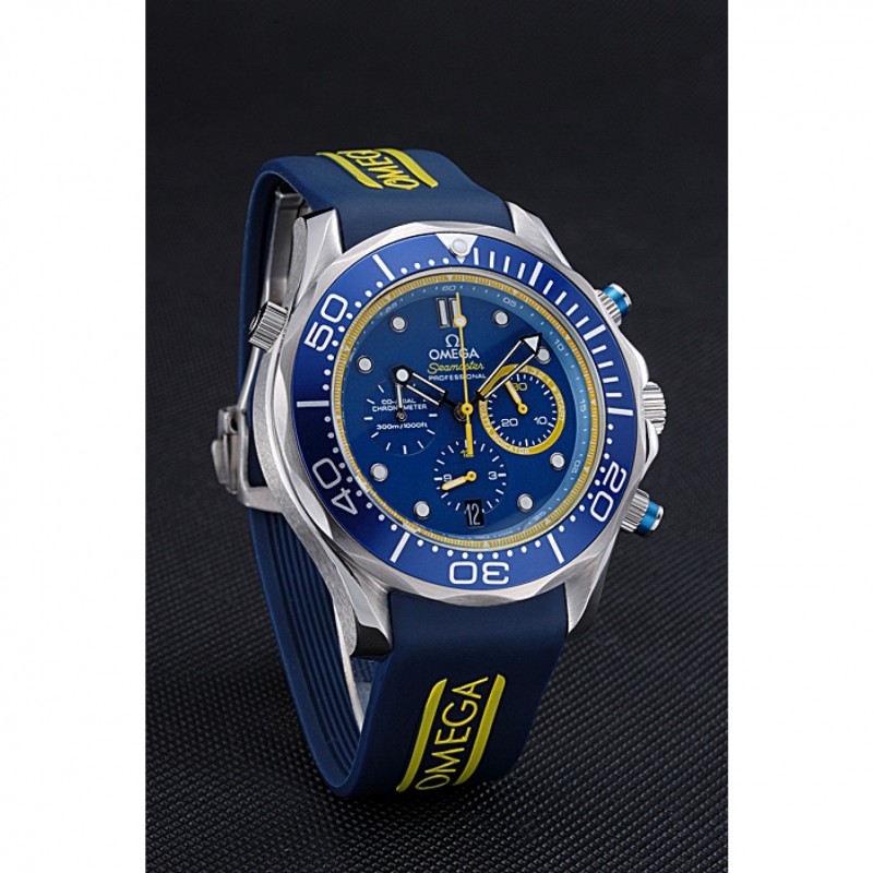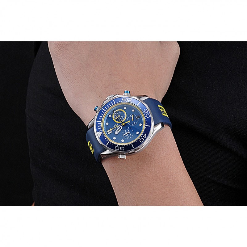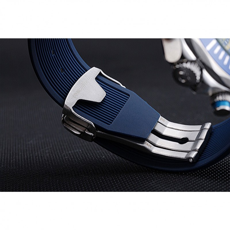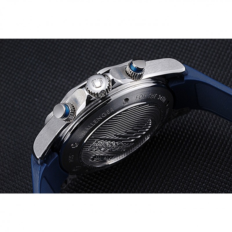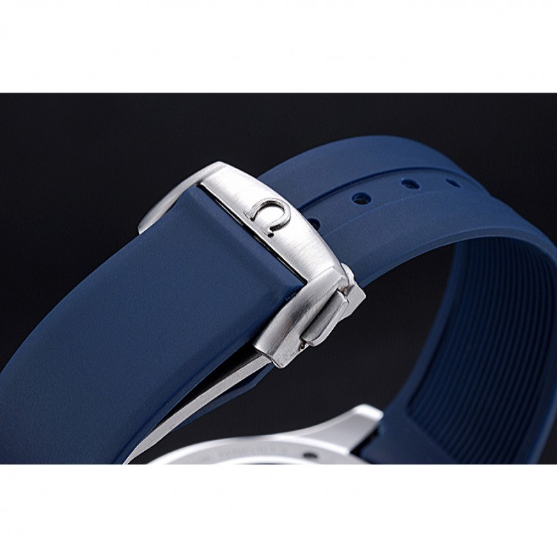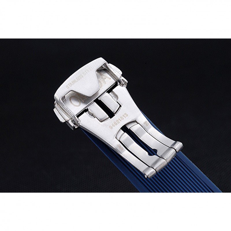 Bracelet:chaleur Omega bracelet en caoutchouc bleu en relief avec logo Omega gravé pli dans fermoir à crochet poussoir à libération acier inoxydable brossé