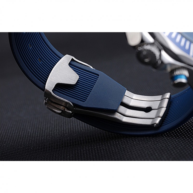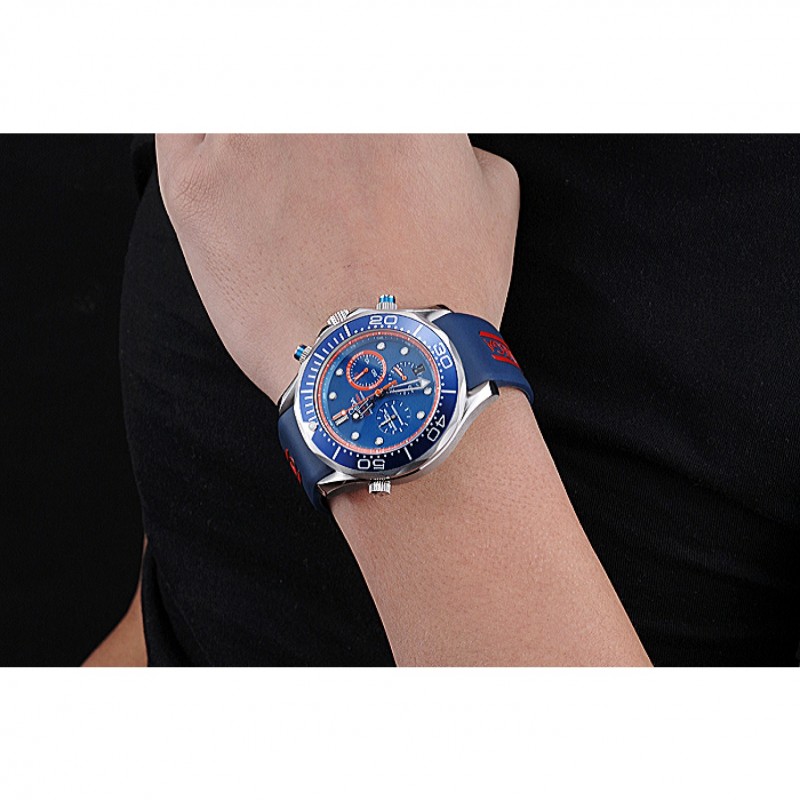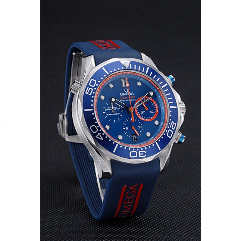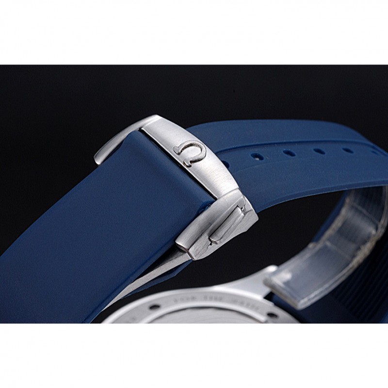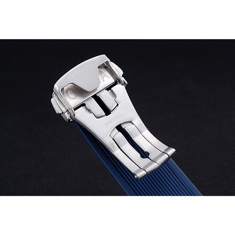 Bracelet:chaleur Omega bracelet en caoutchouc bleu en relief avec logo Omega gravé pli dans fermoir à crochet poussoir à libération acier inoxydable brossé
