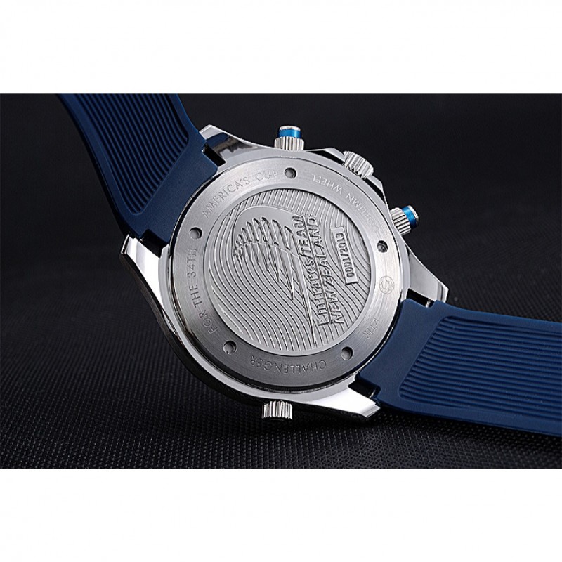 Couronne:Omega logo couronne en acier inoxydable gravé poli cutwork avec bande d’émail bleu bouton poussoir rond couronne de chaque côté de celui-ci, plus un logo gravé couronne en acier inoxydable cutwork poli coin supérieur opposé