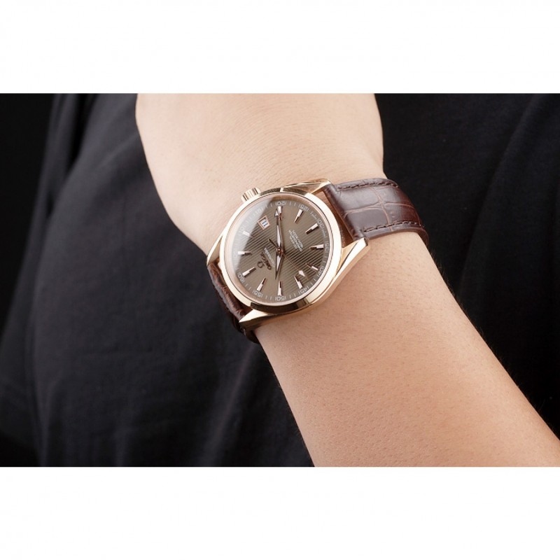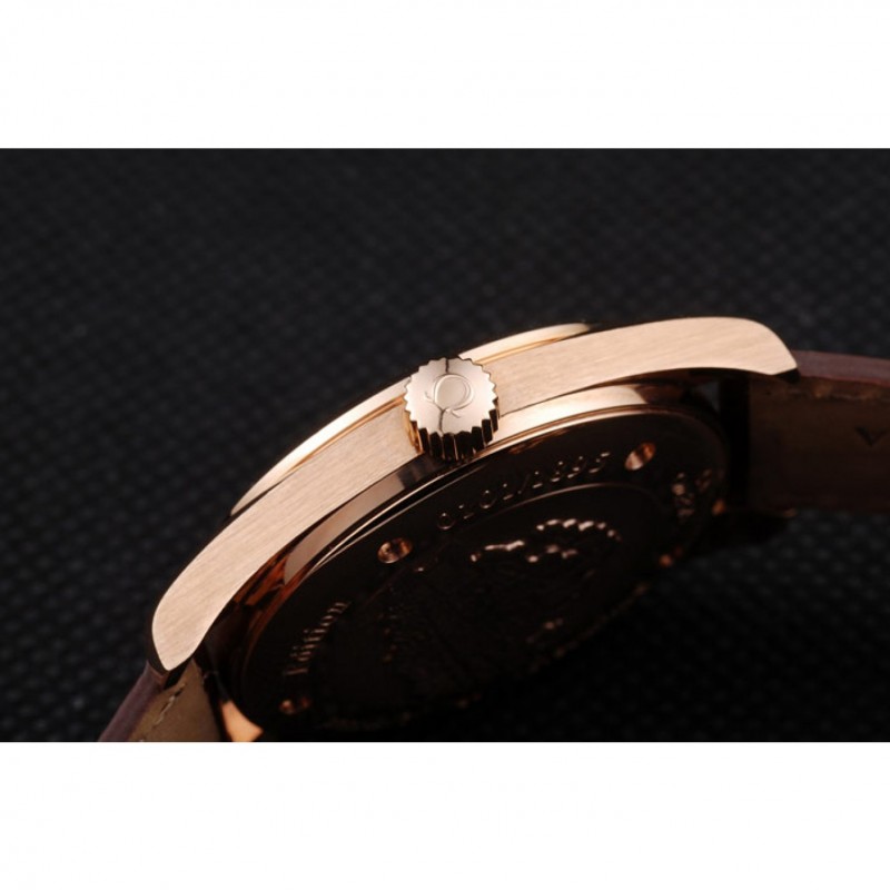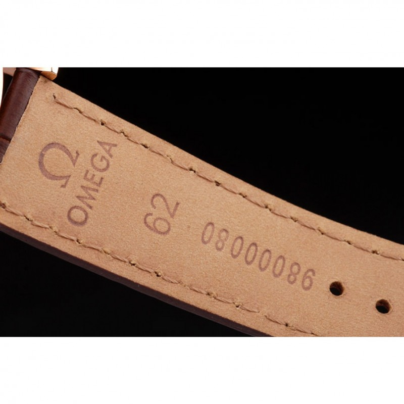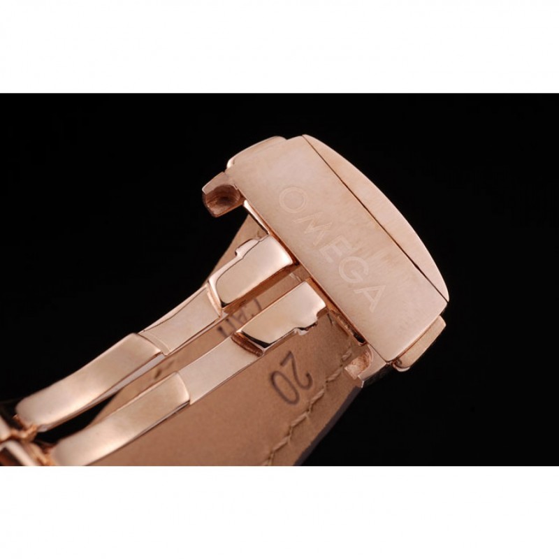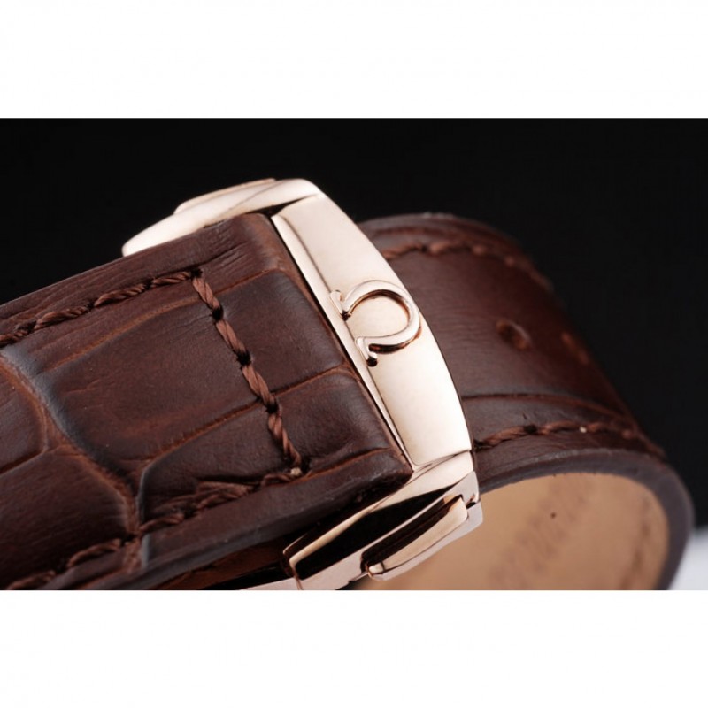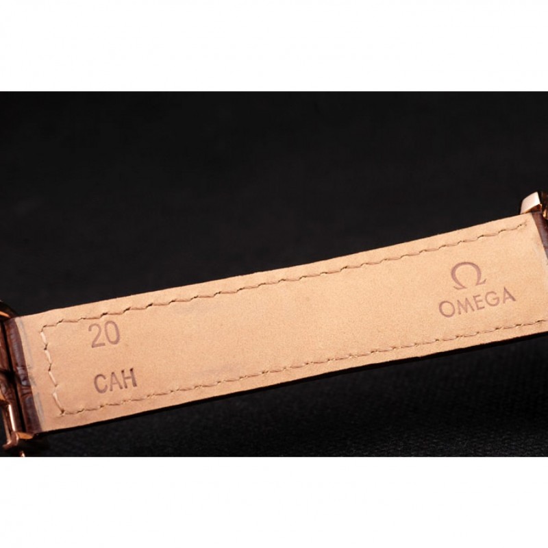 Bracelet:bracelet en cuir brun crocodile avec timbre Omega embossé chaleur et Omega inscrit 18k or rose plier en boucle
