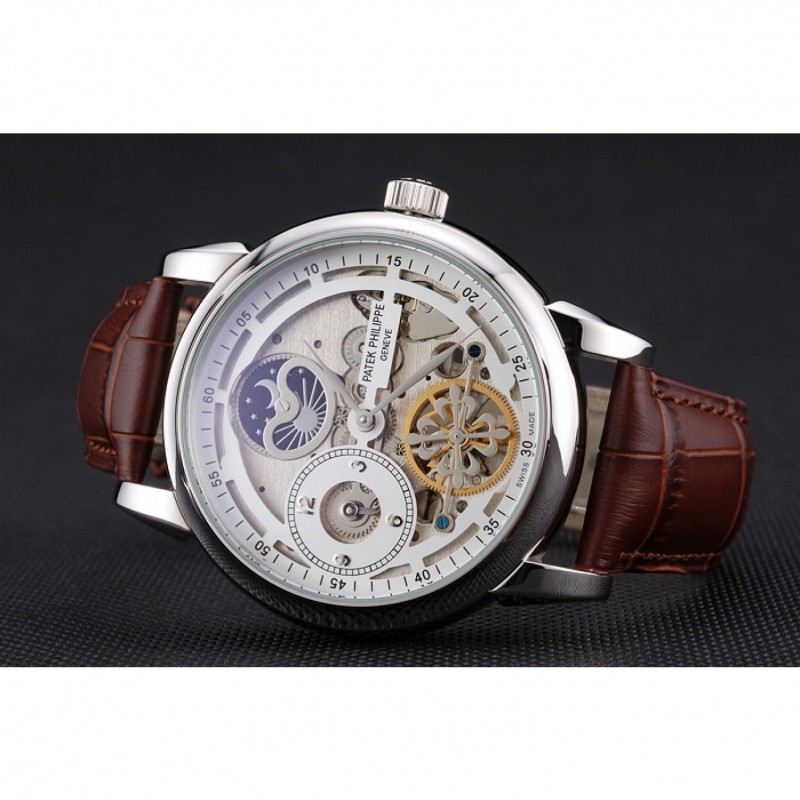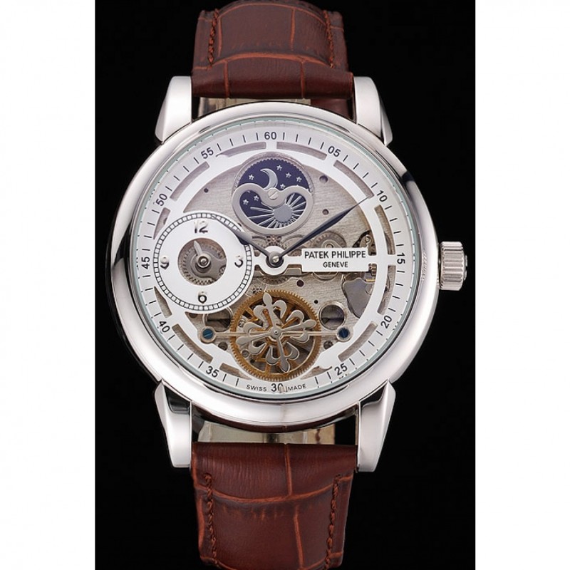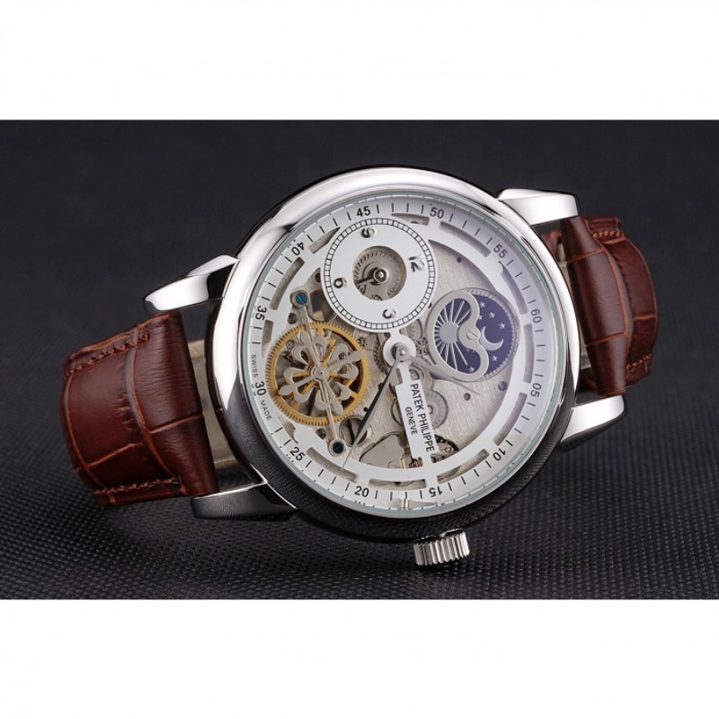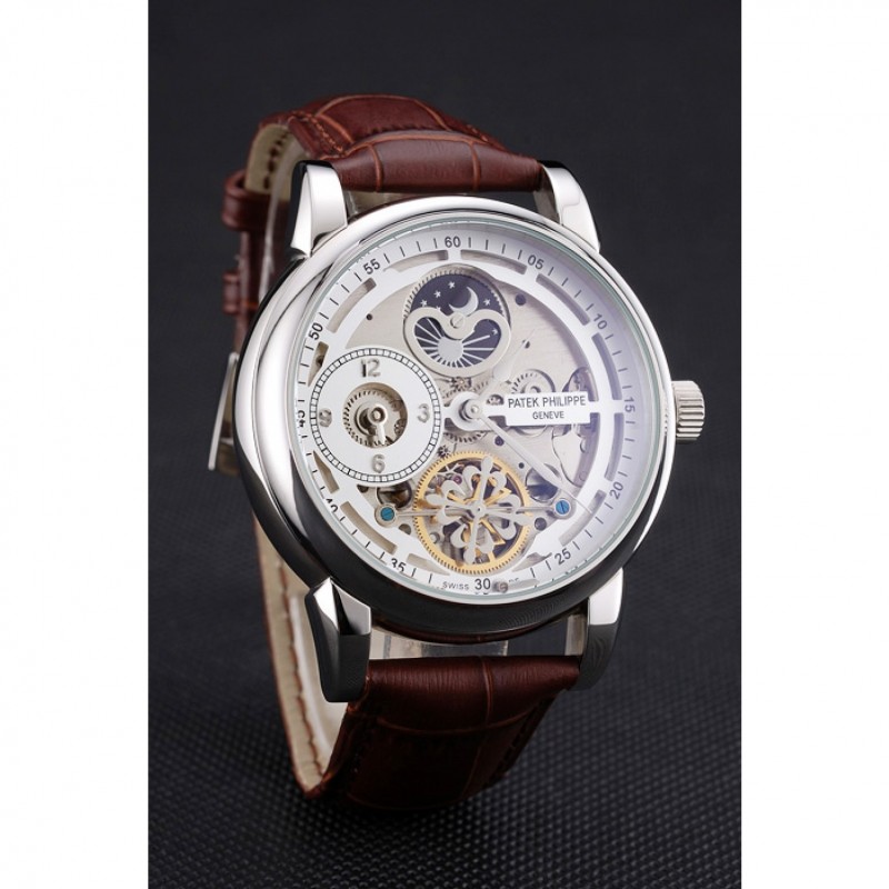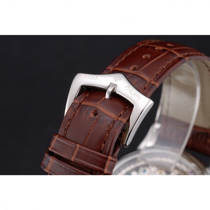 Bracelet:Patek Philippe Geneve chaleur en relief sangle crocodile en cuir marron avec logo et Patek Philippe inscrit en acier inoxydable poli fermoir crochet-boucle