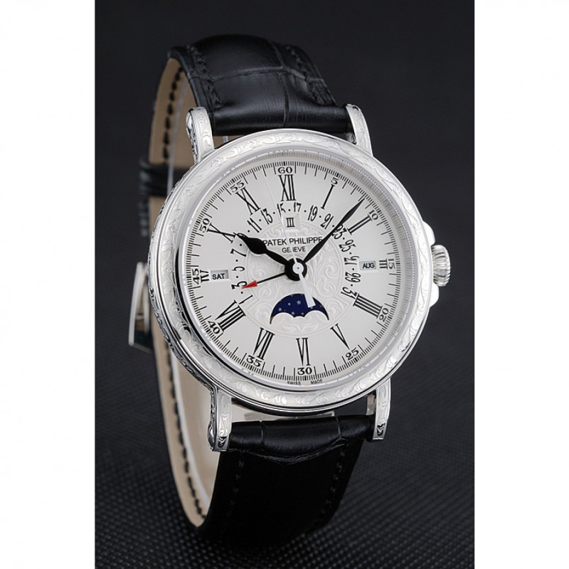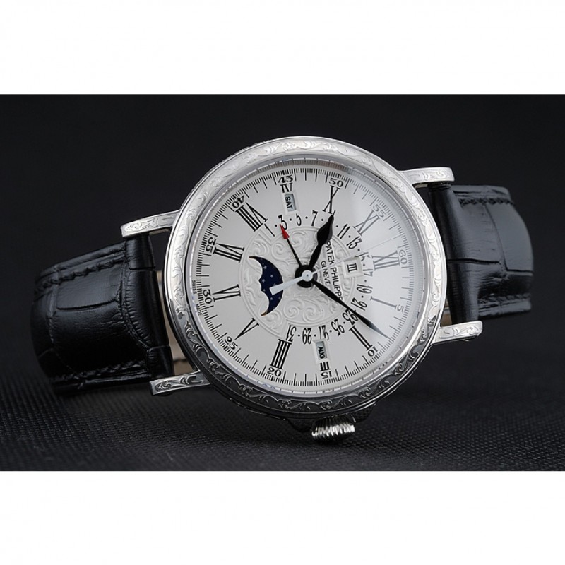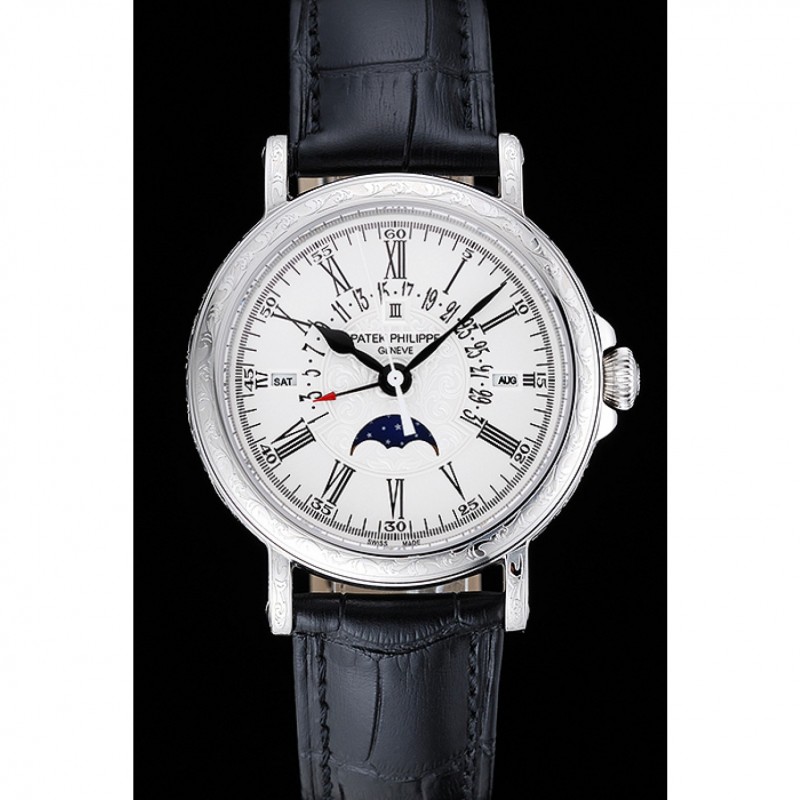 Pas Cher Replique Montre Patek Philippe Quantième Perpétuel Date Rétrograde Cadran Blanc Argent Gravé Caisse noire Bracelet en cuir 1454147