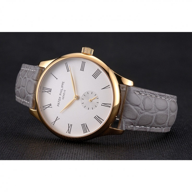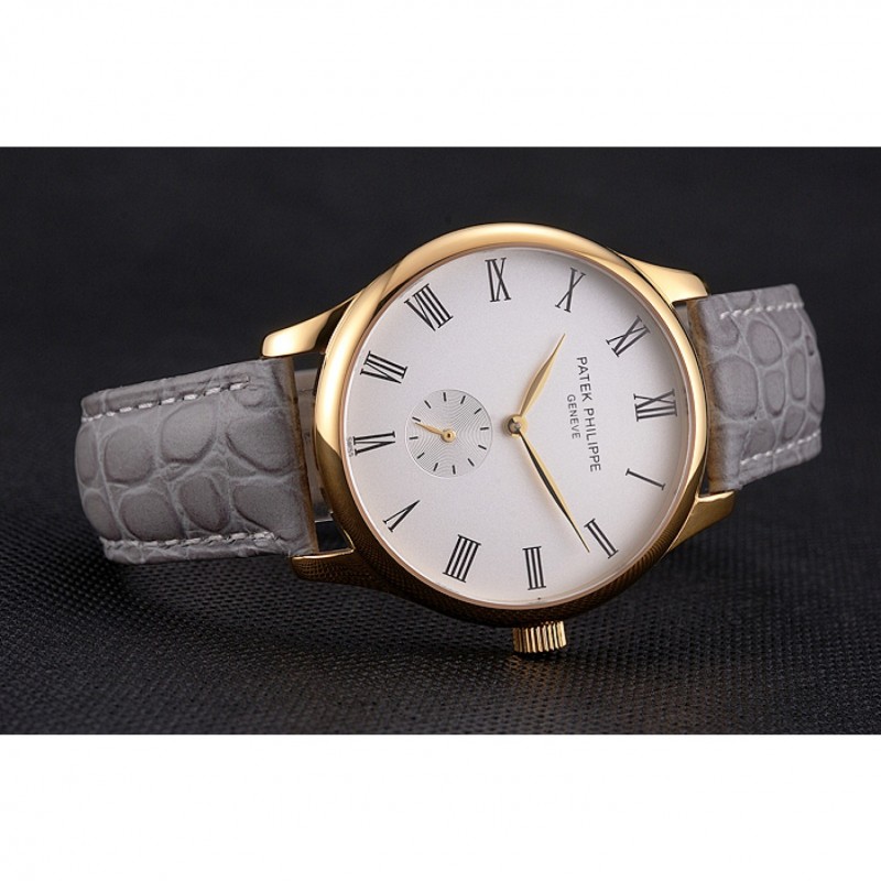 Bracelet:Patek Philippe et logo chaleur embossé bracelet crocodile en cuir gris avec Patek Philippe et le logo inscrit or jaune 18 carats plaqué fermoir crochet boucle