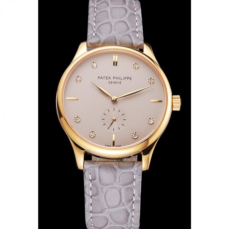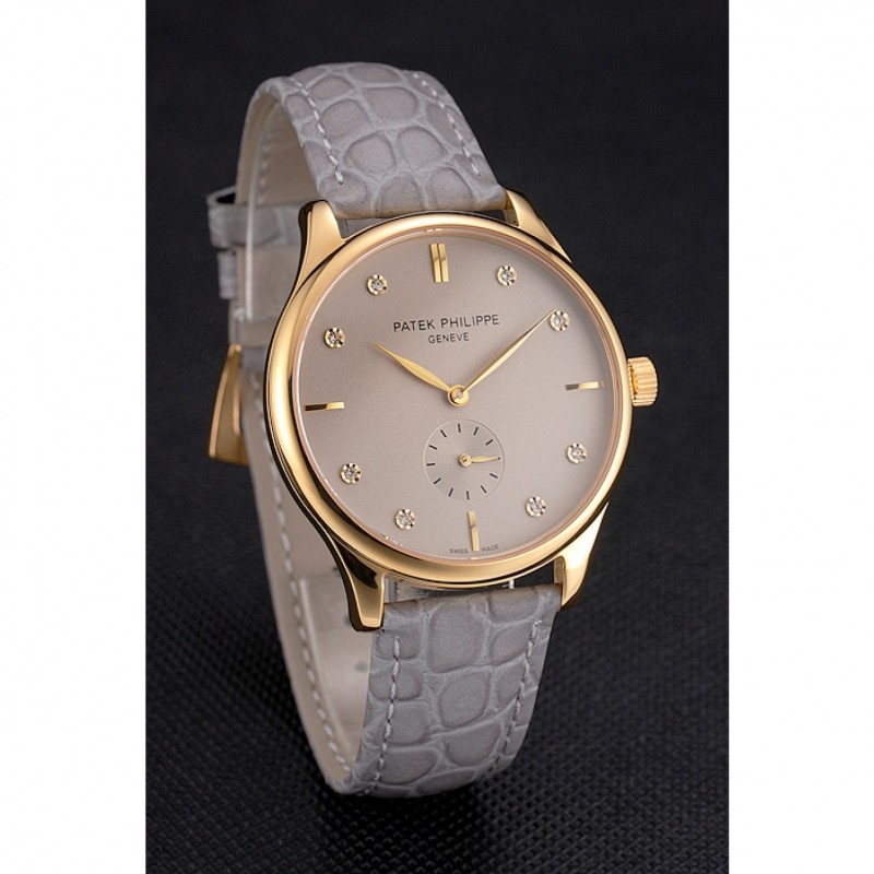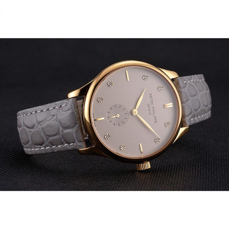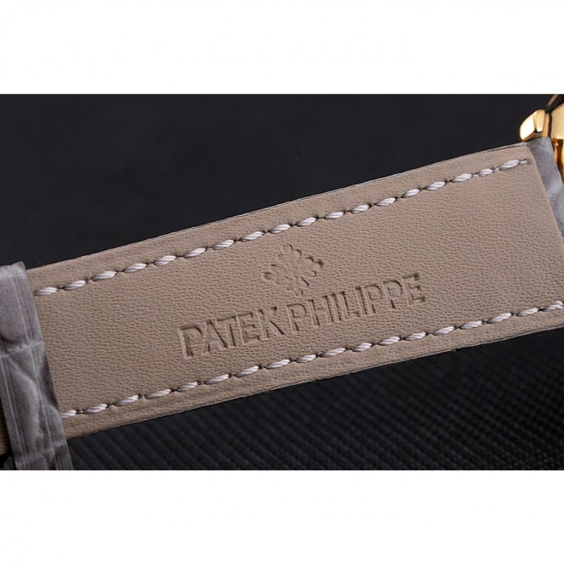Bracelet:Patek Philippe et logo chaleur embossé bracelet crocodile en cuir gris avec Patek Philippe et le logo inscrit or jaune 18 carats plaqué fermoir crochet boucle