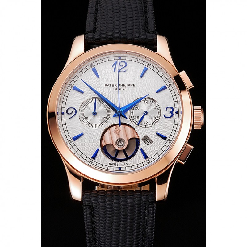 Patek Philippe Chronographe Blanc Cadran guilloché or rose Bracelet en cuir noir