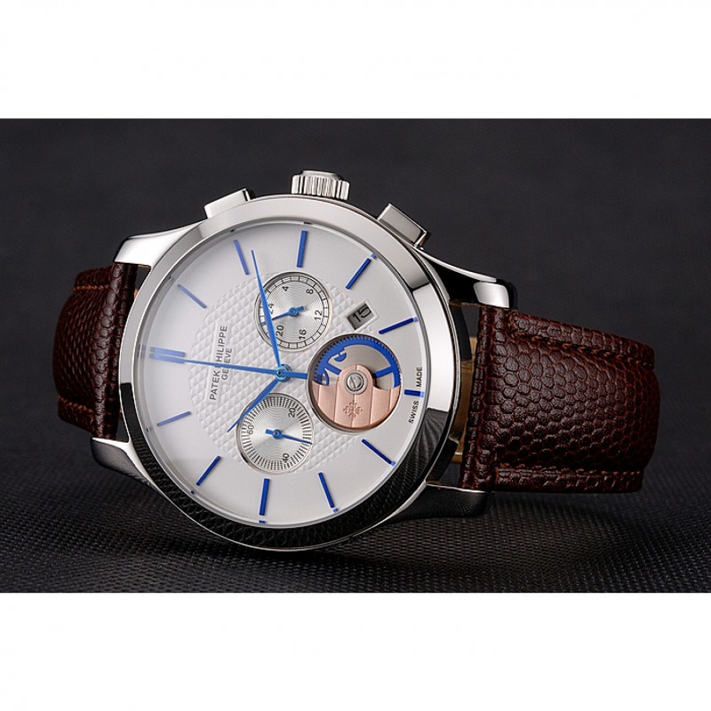 Patek Philippe Chronographe Cadran Blanc Bleu cas Mains en acier inoxydable bracelet en cuir brun