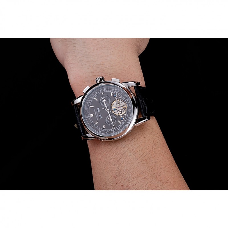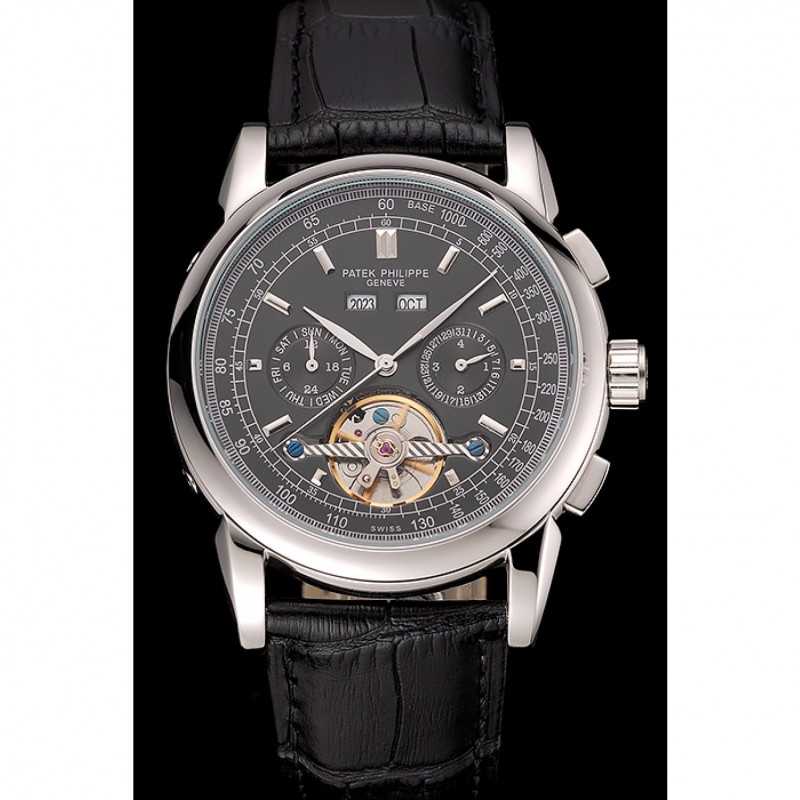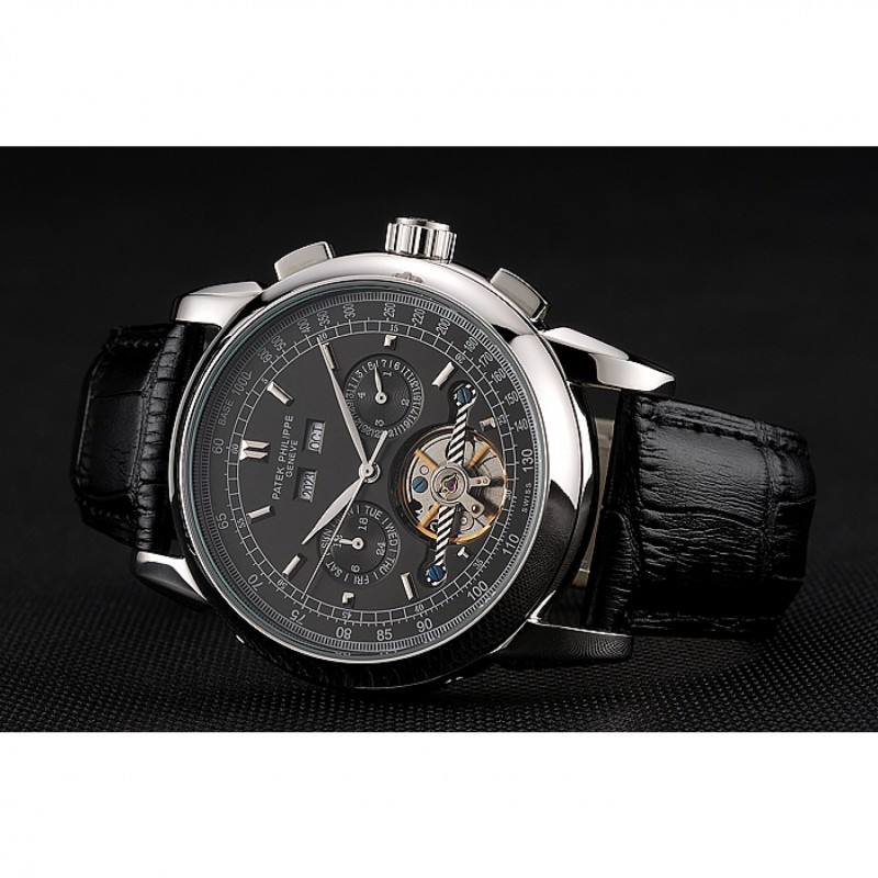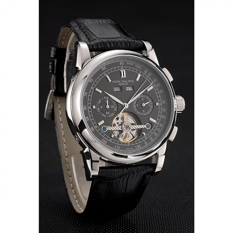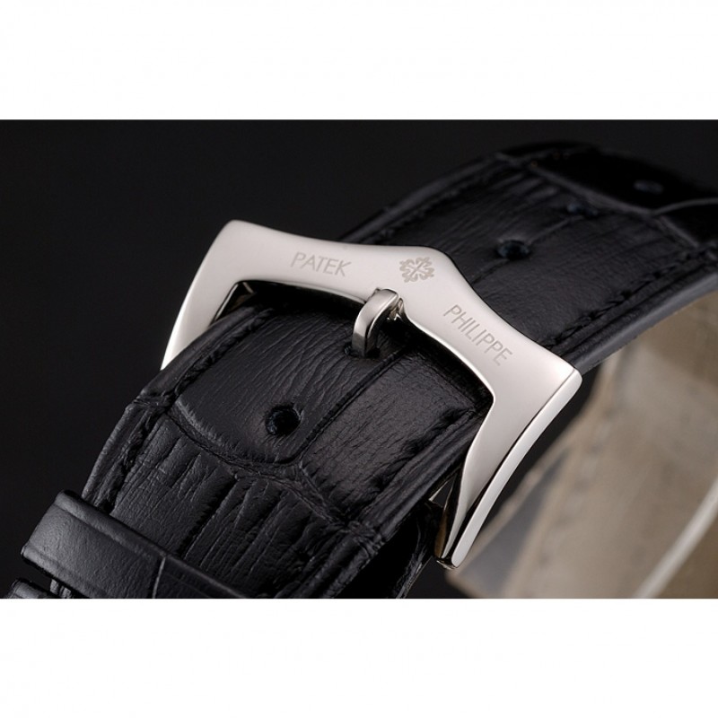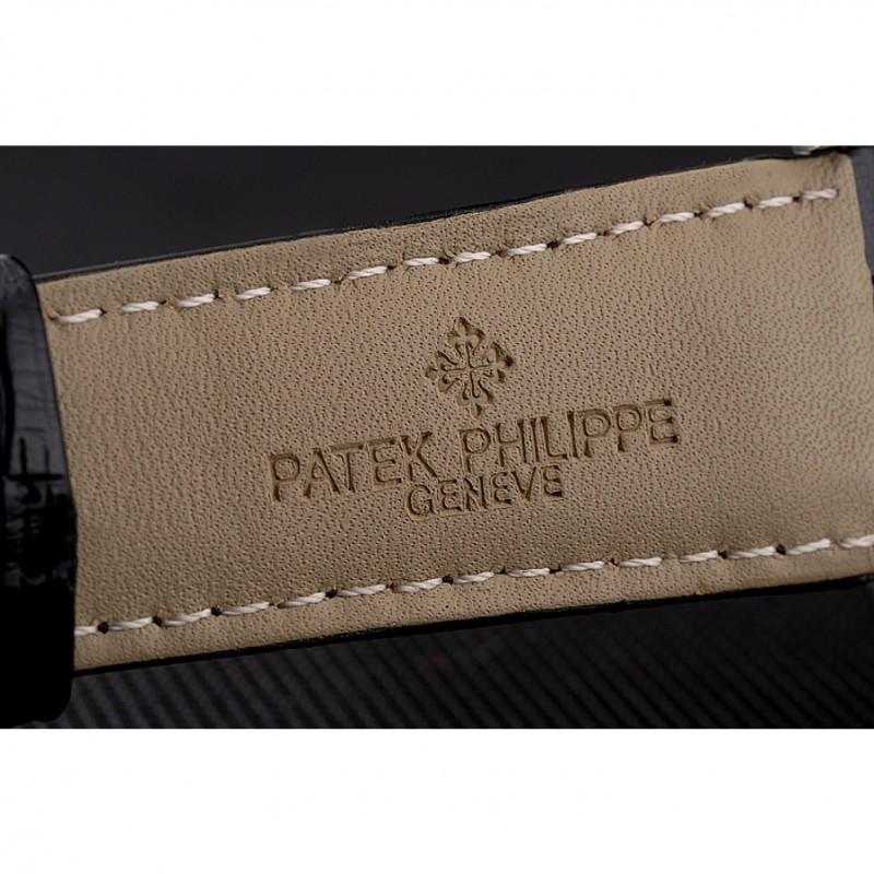 Bracelet :Logo et Patek Philippe Geneve chaleur en relief bracelet en cuir crocodile noir avec fermoir crochet-boucle en acier inoxydable poli