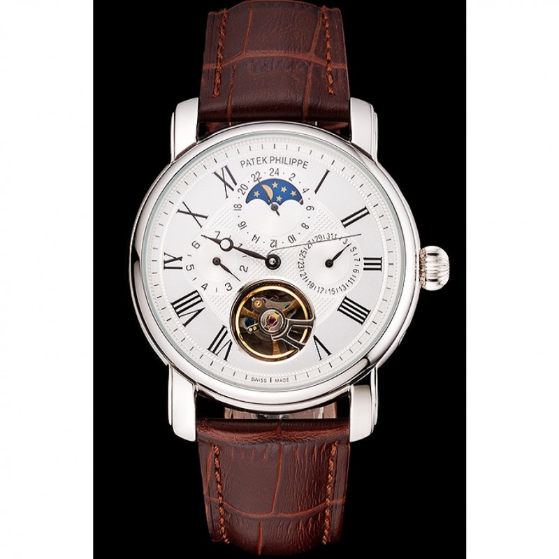 Patek Philippe Grand Complications Moonphase Calendrier perpétuel Tourbillon Cadran Blanc Boîtier en acier inoxydable bracelet en cuir brun