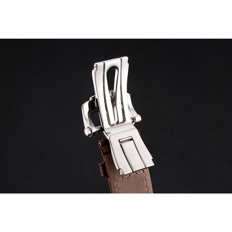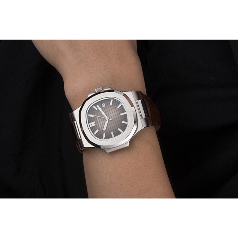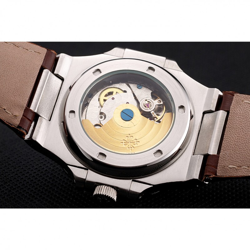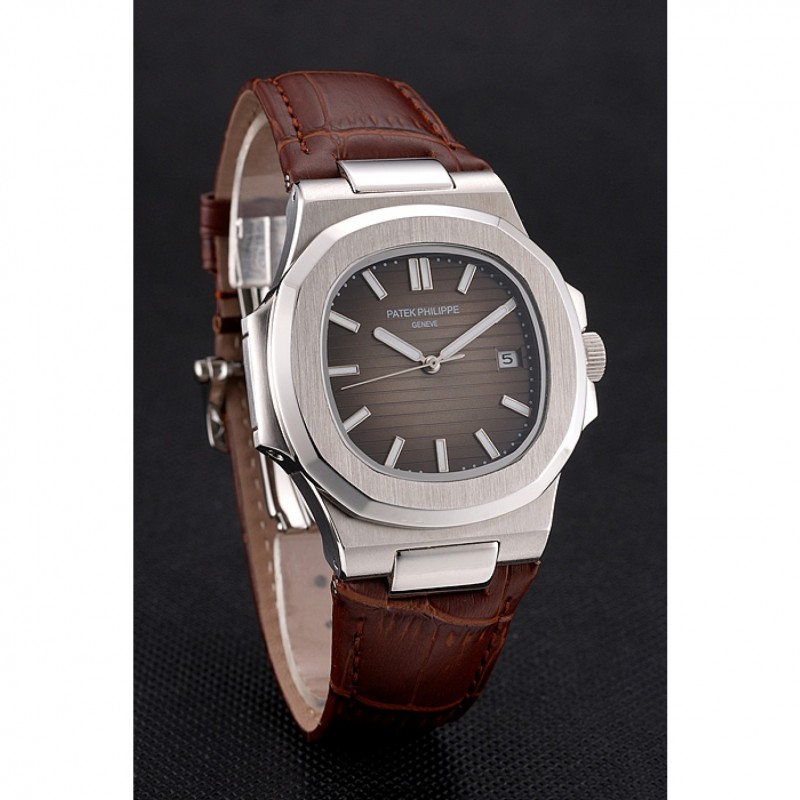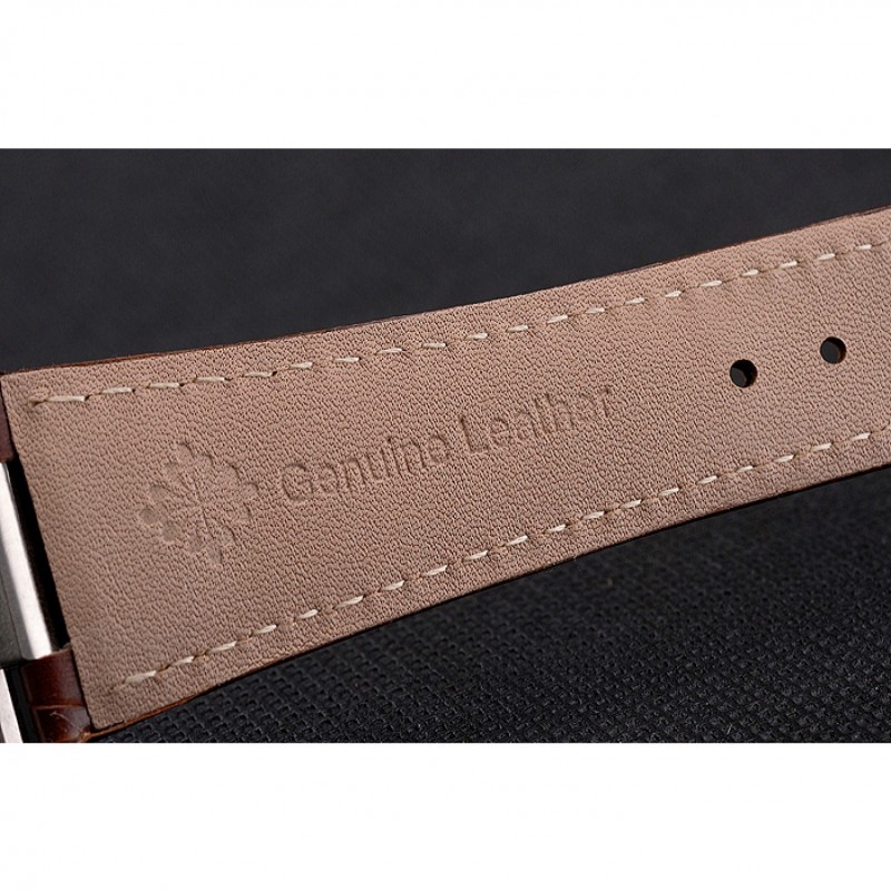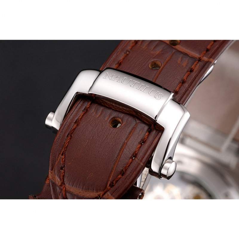 Bracelet:Patek Philippe Geneve chaleur bracelet en cuir de crocodile brun relief avec Nautilus gravé fermoir crochet-boucle en acier inoxydable poli