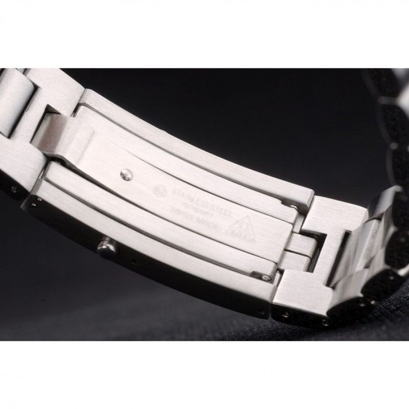 Couronne:couronne en acier inoxydable cutwork poli avec le logo Omega et une couronne de bouton-poussoir de chaque côté de celui-ci, plus une couronne cutwork sur le côté opposé