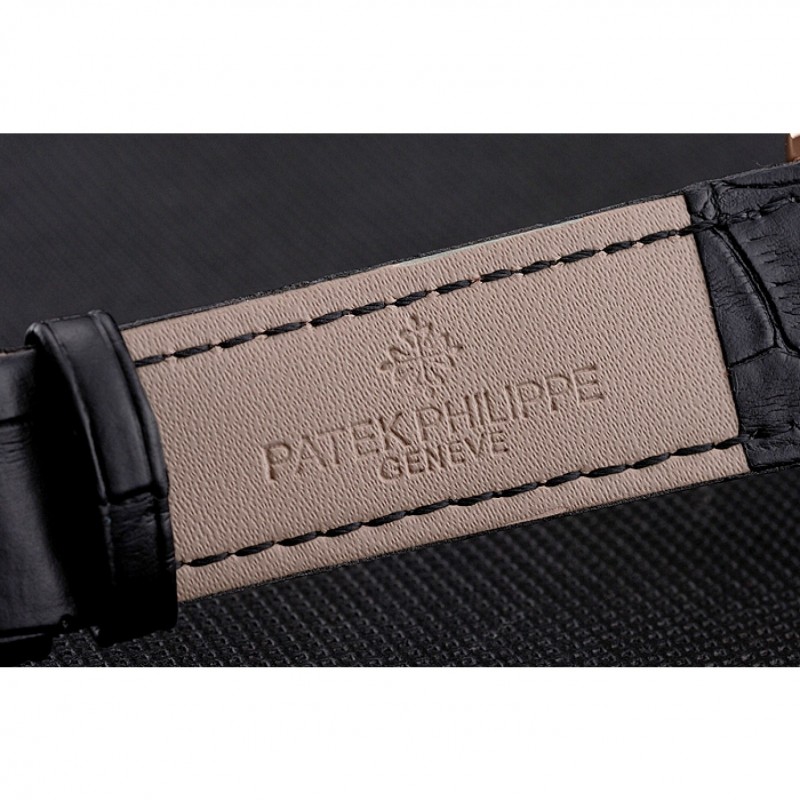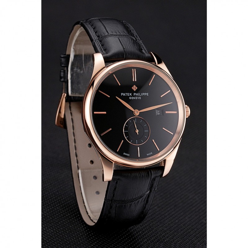 SS Replique Montre Patek Philippe Calatrava Date de cadran noir boîtier en or rose Bracelet en cuir noir