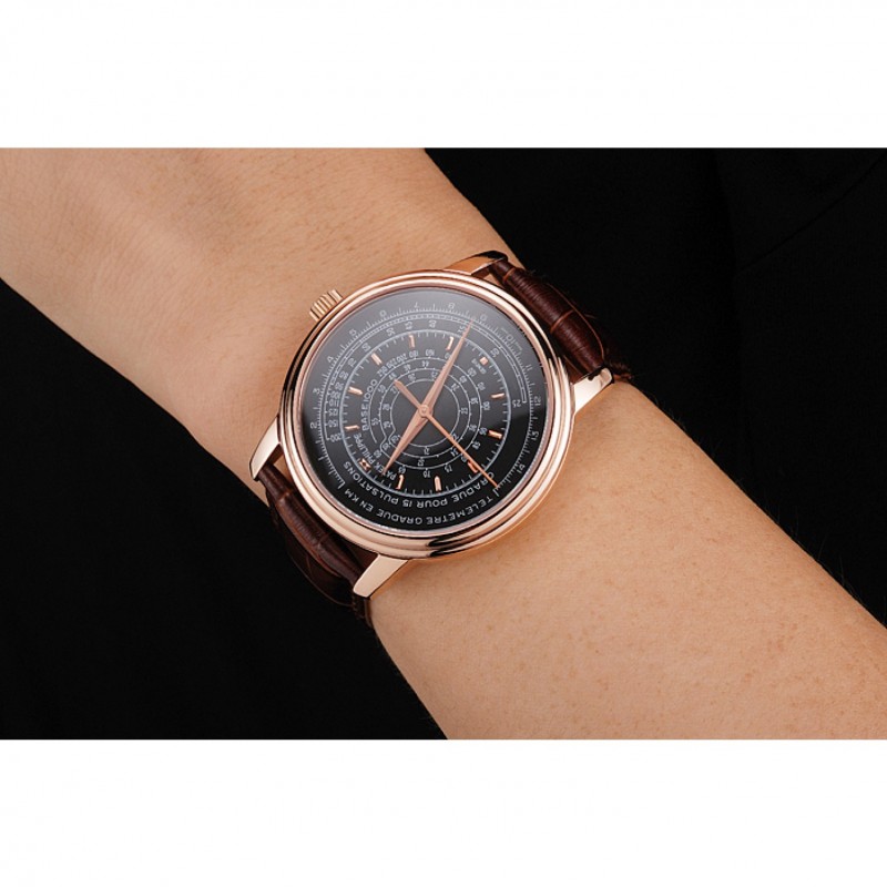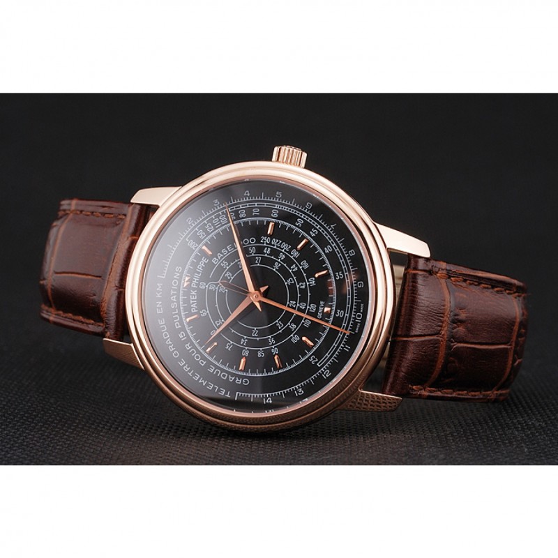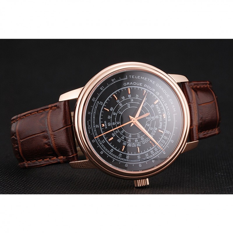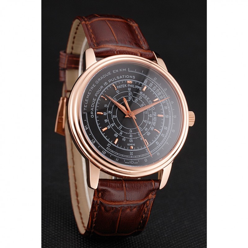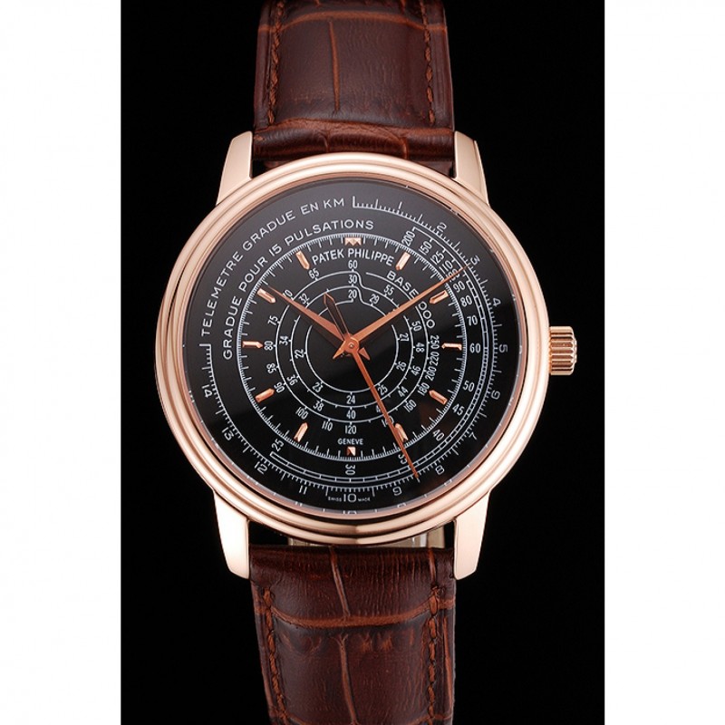 SS Suisse Patek Philippe multi-échelle chronographe cadran noir boîtier en or rose bracelet en cuir brun