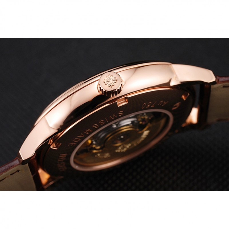 Retour:18k Rose- plaqué or enfichable à l’arrière avec Patek Philippe gravures et mécanique révélant transparent fenêtre