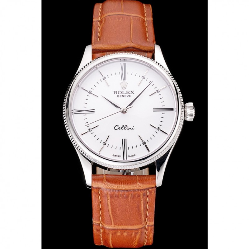 SS Swiss Rolex Cellini Cadran Blanc Cas en acier inoxydable Roman Numerals bracelet en cuir brun clair