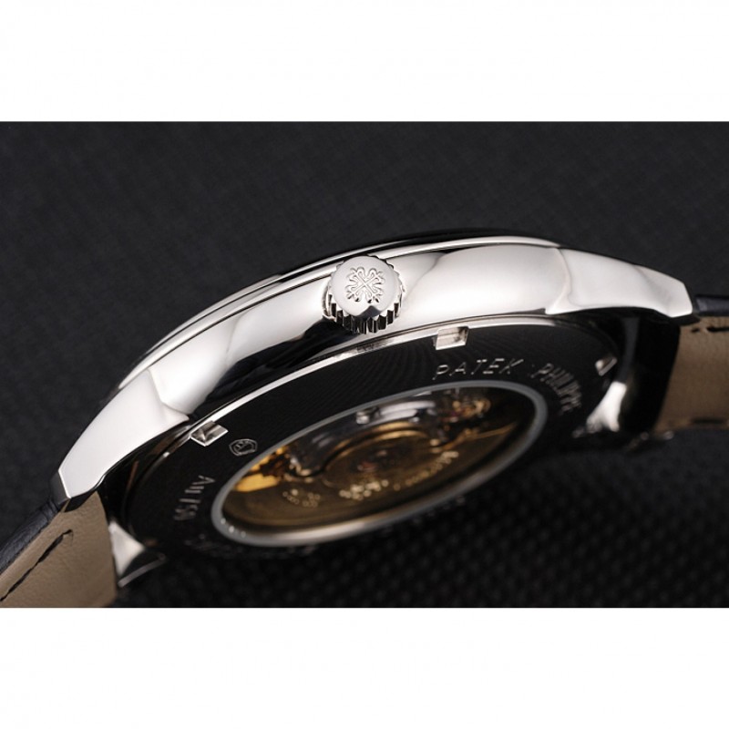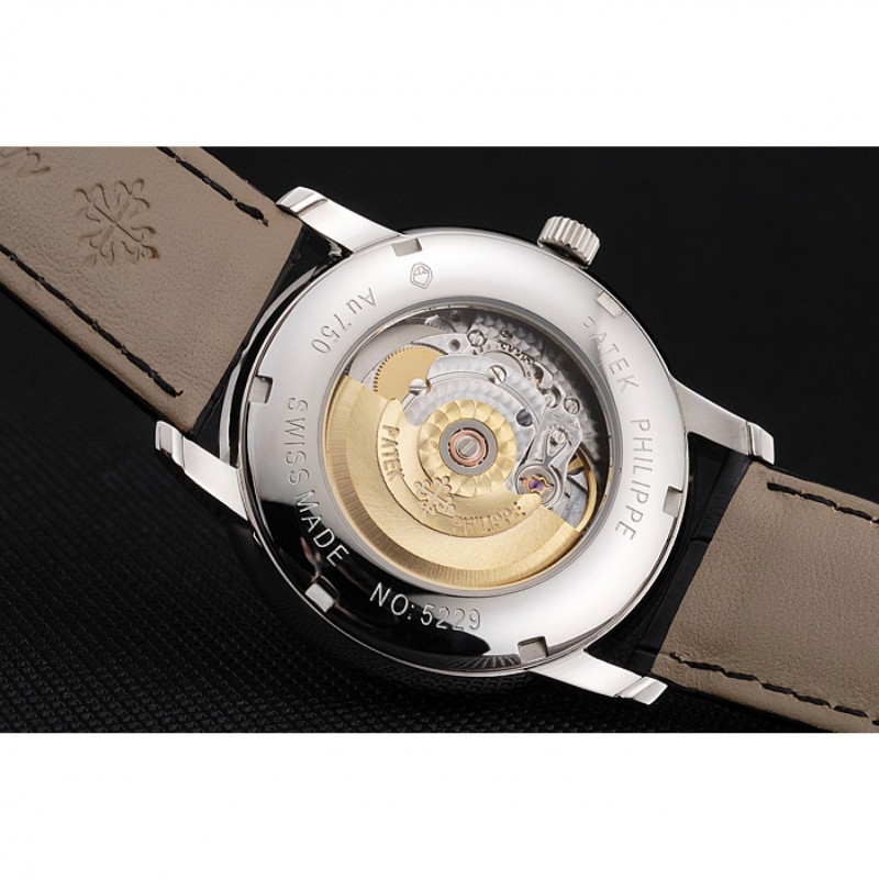 Retour:transparent mécanique révélant retour avec un acier inoxydable poli enfichable jante et inscription Patek Philippe