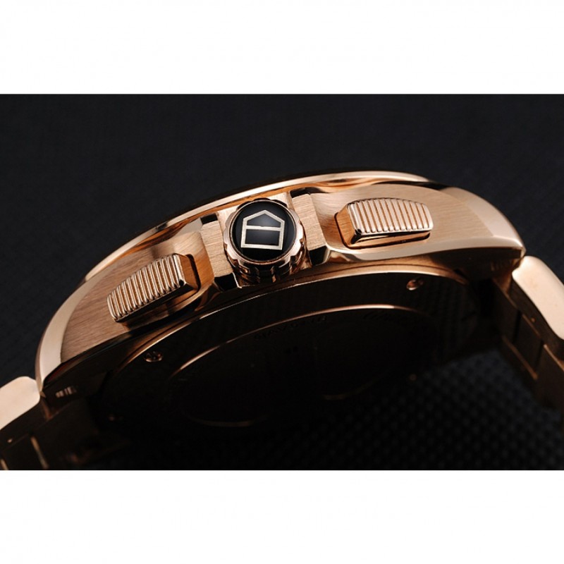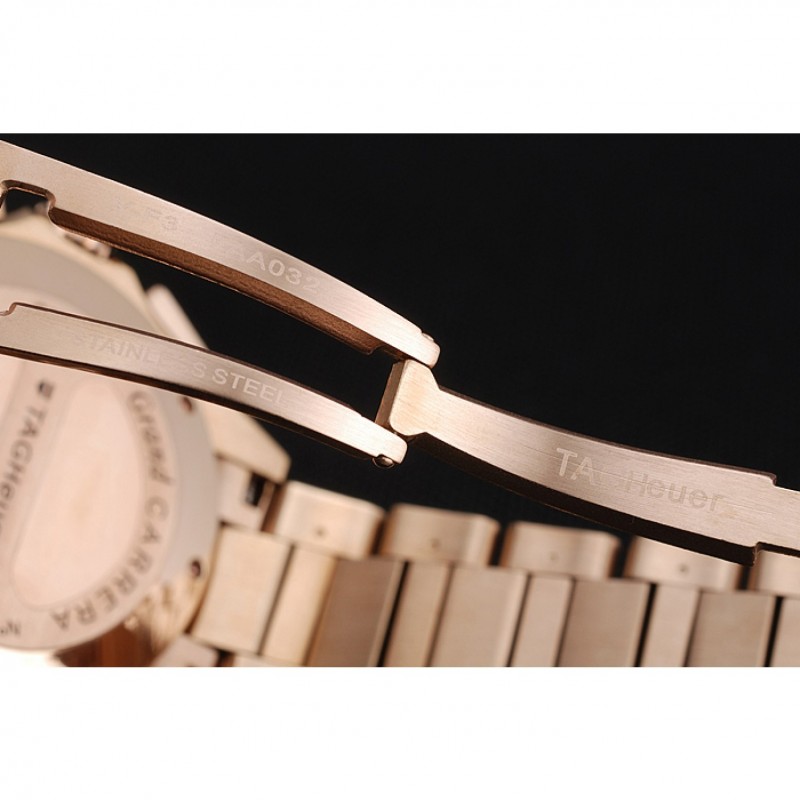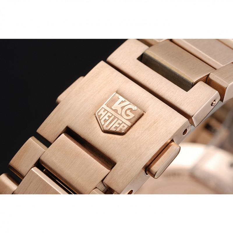 Couronne:Rose-plaqué or couronne cutwork avec Tag Heuer logo et bande rouge garniture et deux couronnes à bouton-poussoir longues de chaque côté de celui-ci, plus un logo gravé en or rose plaqué couronne bande rouge garniture dans le coin supérieur opposé